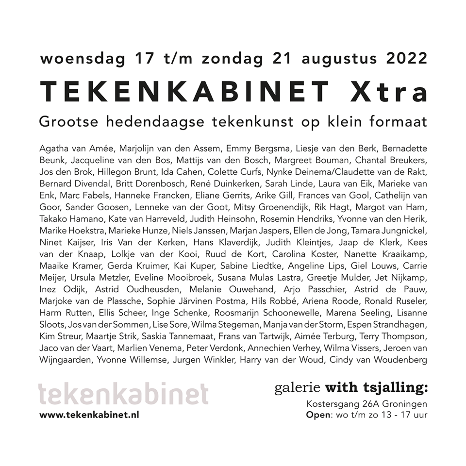 In augustus is het Tekenkabinet te gast in galerie with tsjalling. Het Tekenkabinet is sinds 2013 een onafhankelijk podium voor hedendaagse, autonome tekenkunst. Jaarlijks worden op wisselende locaties wand- en ruimtevullende tentoonstellingen gerealiseerd waarin hedendaagse tekenkunst de hoofdrol speelt. Na eerdere edities in een museum, een kunstsalon, een showroom, een kunsthuis, een huiskamer, een kunstbeurs, een winkelpand, een woonhuis, een paviljoen in een park, wordt het tweede lustrum dit jaar gevierd in twee uiteenlopende en uiteenliggende galeries.